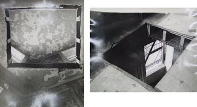 Office Baroque, a lyrical cutting through a five-story Antwerp office building, was the artist’s second-to-last architectural project before his untimely death. Inspired by overlapping teacup rings left on a drawing, the carving was organized around two semicircles that arced rhythmically through the floors, creating a rowboat shape at their intersection. Matta-Clark described the piece as “a walk through a panoramic arabesque.“ As in all his interventions, the building itself constituted the work of art. To counter the ephemeral nature of his sculptural gestures, he emulated their dynamic spatial and temporal qualities in unique photographs made by splicing and grafting negatives to create quasi-Cubistic images. No substitute for balancing precariously on the flayed edge of a structural cut, the photographs nevertheless document the essential aesthetic of Matta-Clark’s “anarchitecture.”" - Nancy Spector for the Guggenheim Collection.